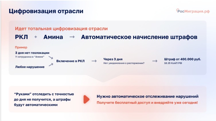 В помощь бизнесу, для работодателей, рискующих быть оштрафованными автоматически по признакам присутствия трудоустроенных мигрантов в РКЛ и несвоевременной подачи уведомления об увольнении таковых в МВД, «РосМиграция.рф» создала онлайн-сервис массового контроля нарушений трудоустроенных мигрантов, который был высоко оценен участниками и организаторами конференции, работающими с сотнями и тысячами мигрантов в штате.