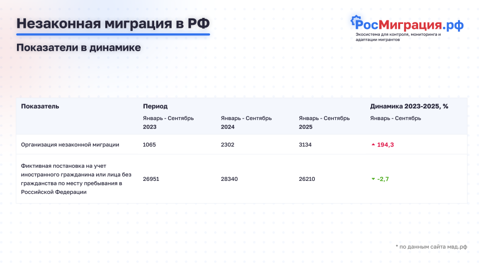 Аналитической службой «РосМиграция.рф» было проведено исследование изменений показателей за период последних двух лет, основываясь на актуальной статистике с января по сентябрь 2025 года. Для объективного сопоставления использовались те же данные за аналогичный временной промежуток двухлетней давности. Анализ проводился по таким ключевым аспектам, как организация незаконного въезда мигрантов и случаи фиктивной постановки на учет иностранных граждан и лиц без гражданства.