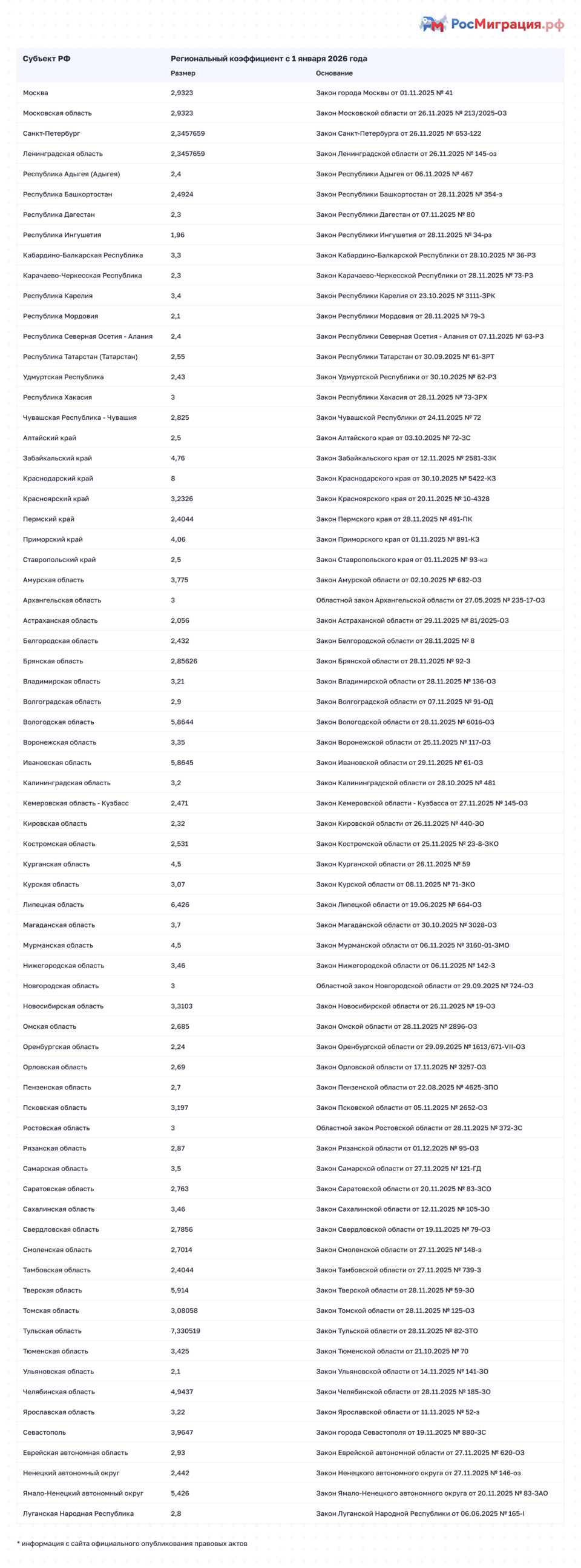 На данный момент практически все субъекты федерации утвердили значение регионального коэффициента, применяемого в целях исчисления стоимости патента для безвизовых трудовых мигрантов, на следующий 2026 год.